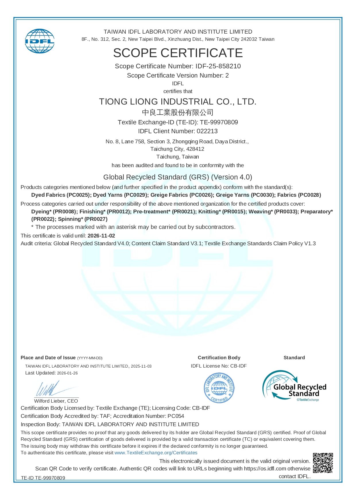 ● TLC는 GRS(글로벌 재활용 표준) 인증서를 취득했습니다.