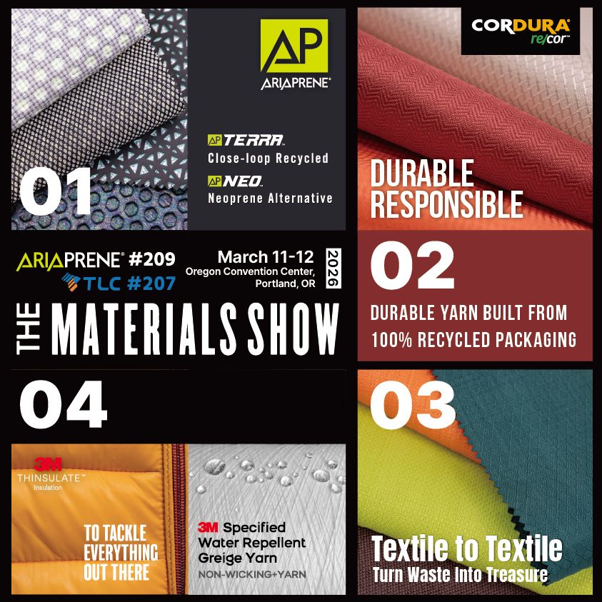 ● CORDURA® re/cor™: Trình bày sức mạnh của vải polyester tái chế có độ bền cao, được chuyển đổi từ chai và bao bì đã qua sử dụng.